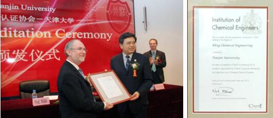 2007年3月,天津大學化學工程專業國際認證領導小組和工作小組成立,通過系統學習認證規則、收集和整理認證資料、撰寫認證報告、培訓教職員工等方式,著力推動相關工作進行。2008年7月,天津大學正式提交國際認證報告和相關資料。2008年10月,IChemE專業認證專家組到天津大學進行考察。2009年4月,IChemE專業認證委員會主席ColinWebb教授親自到天大,將化學工程專業認證證書頒發給天津大學。