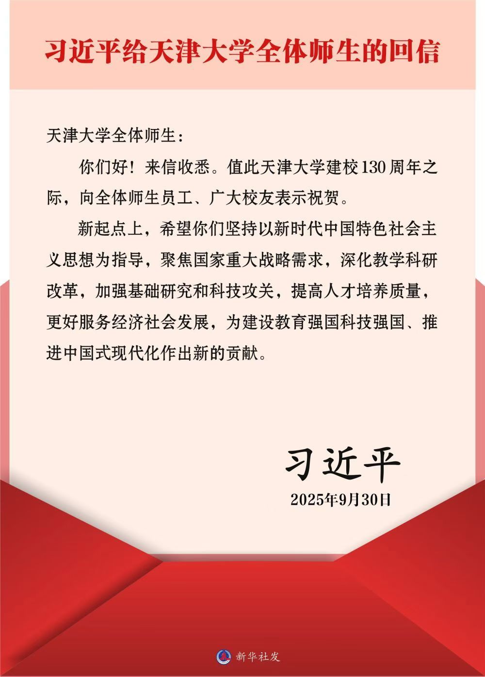 新華社北京10月2日電?近日,中共中央總書記、國(guó)家主席、中央軍委主席習(xí)近平給天津大學(xué)全體師生回信,在天津大學(xué)建校130周年之際,向全體師生員工、廣大校友表示祝賀。